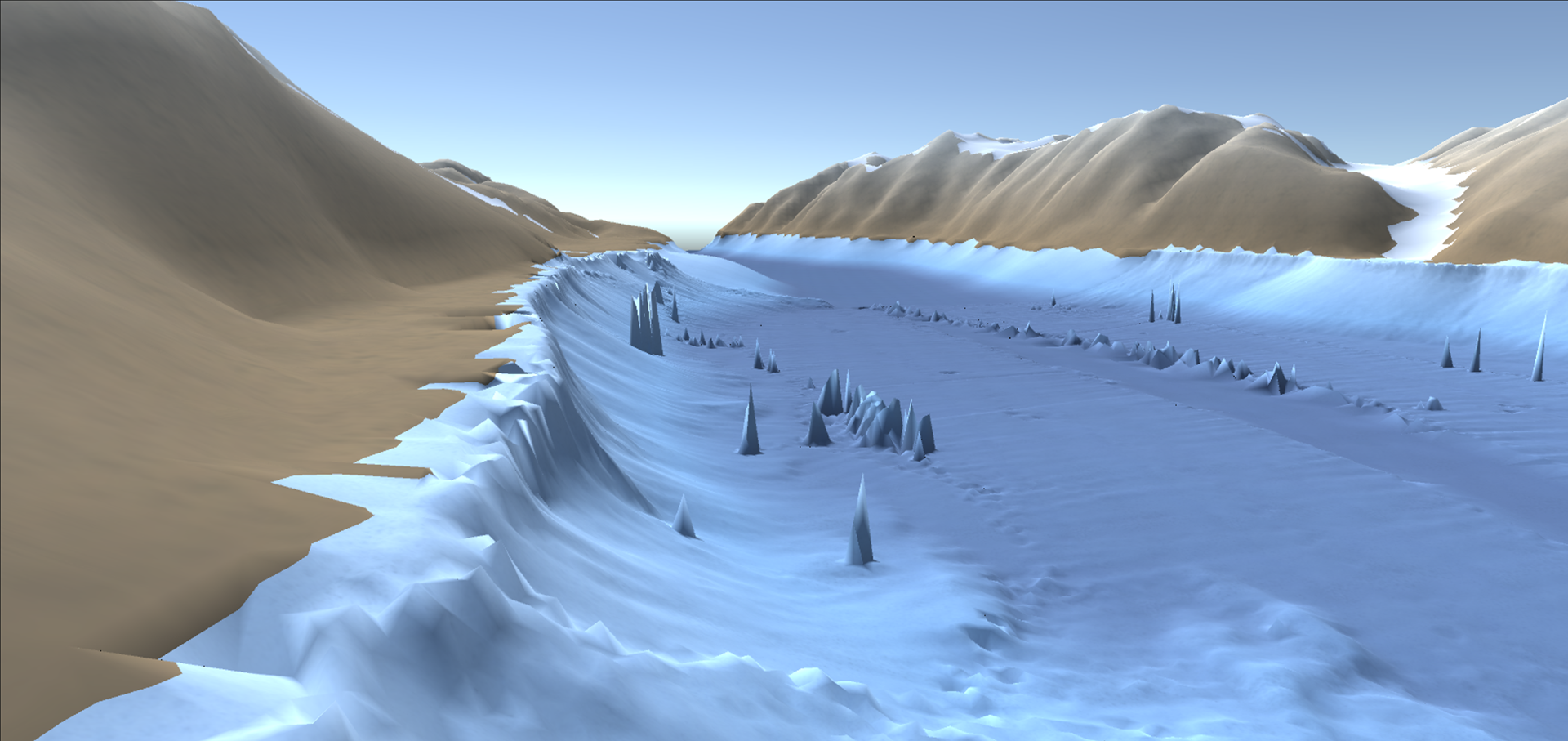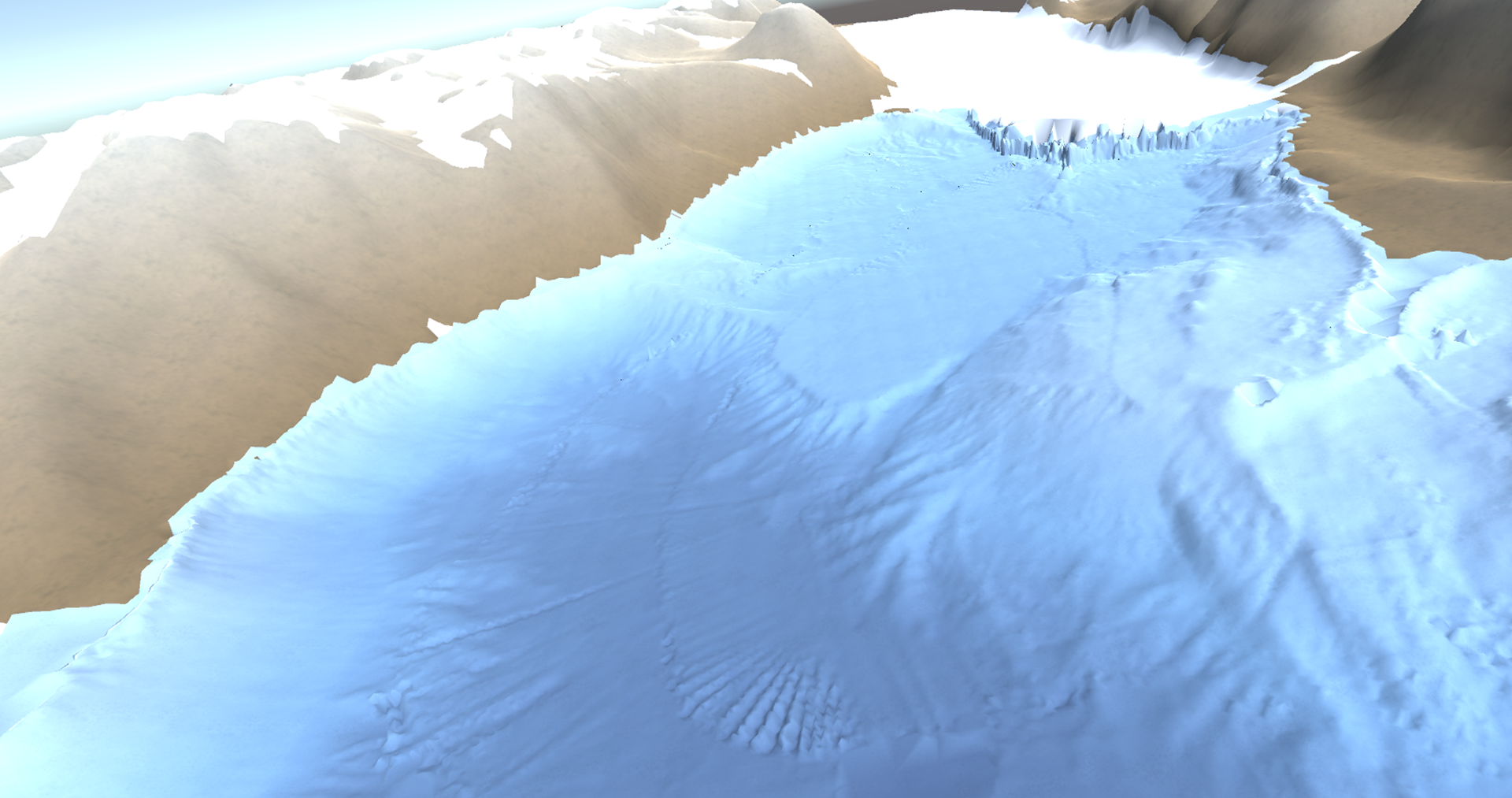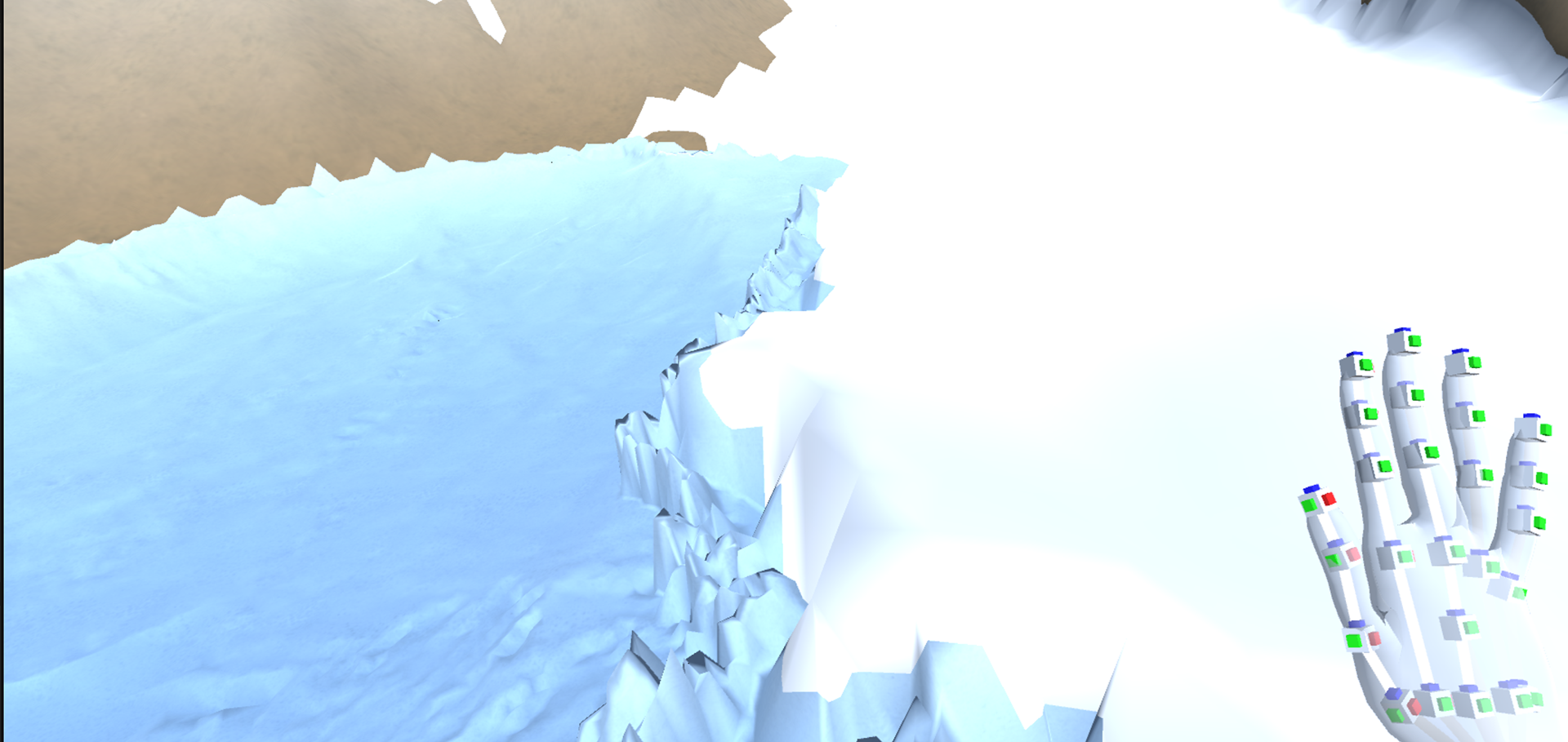 I've been learning how to develop VR experiences using the Unity game engine. The Greenland Project was the first job and project that had me working with VR technology. I worked on this project for about a year, and in that year, I learned a great deal about how VR works and how to design for it. My primary role on this project was to serve as the lead VR designer and developer, working with the Topography data models prepared by the TACC team and gathered by scientists.