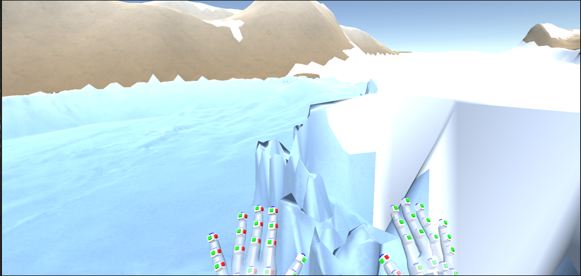 The main thing I developed and designed was the method for how the player would move around in the space, using hand tracking as the control method. We reasoned that many of the scientists we worked with had never used a controller before, so we hoped that using the user's hands and simple hand gestures would provide more intuitive controls.