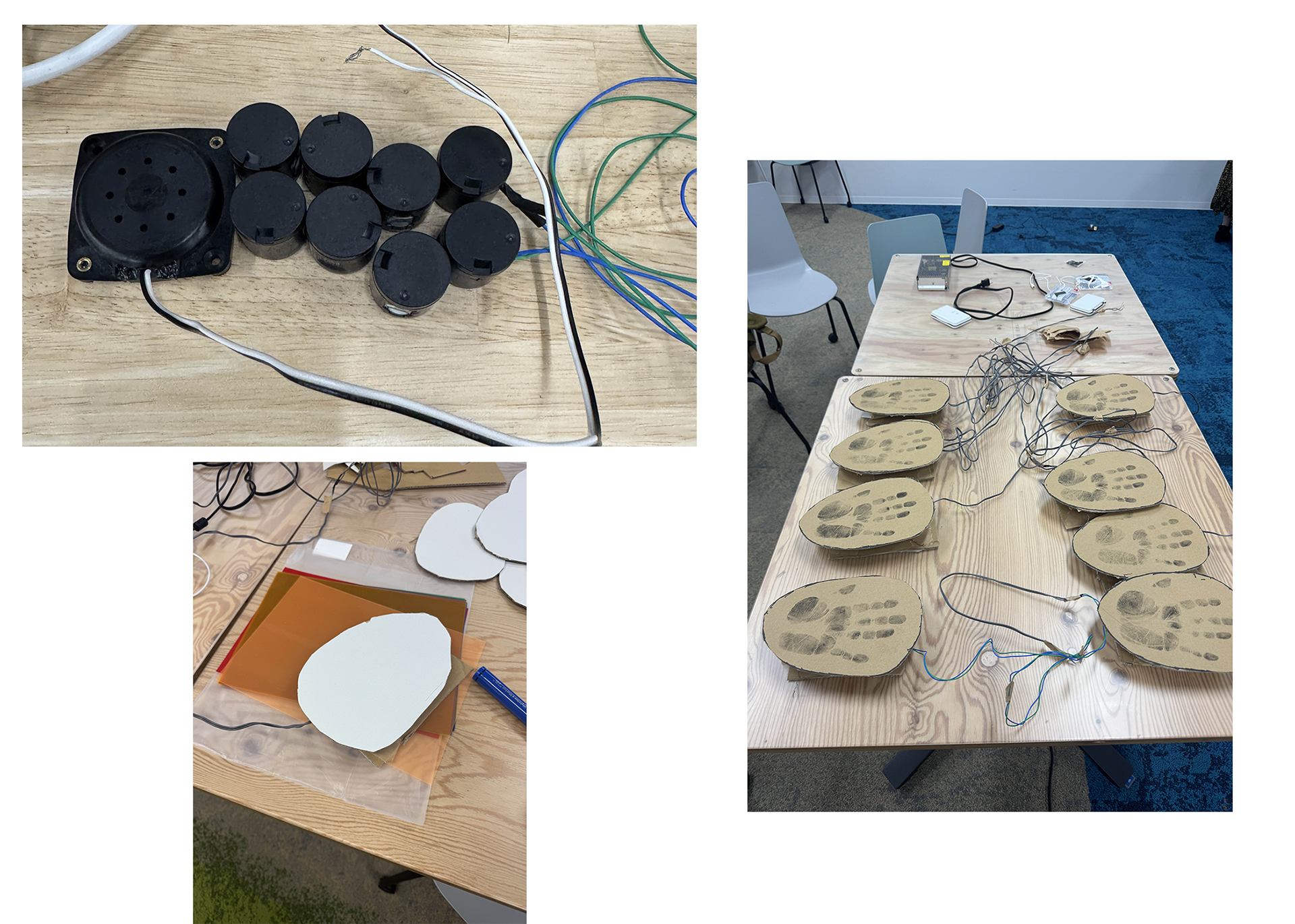 After that, a few others and I soldered wires onto the ends and hooked it up to an amplifier. The wires were hidden beneath the tree's roots, and cardboard was used to house the haptics and provide a large, flat surface for a user to touch.